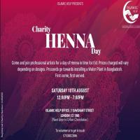 Come and join professional artists for a day of henna in time for Eid. Prices charged will vary depending on designs. Proceeds go towards installing a Water Plant in Bangladesh. Henna will be done on a first come first served basis.