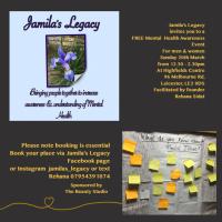Jamila's Legacy invites you to our next Free Mental Awareness Event for men & women. Jamila's Legacy brings people together to increase awareness & understanding of mental health. Our events include discussions & workshops on self care, supporting others and guest speakers who share their personal stories of living with a mental illness.