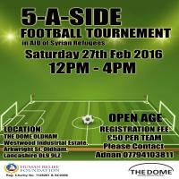 Human Relief Foundation and TheDome Oldham will be hosting Open Age 5-A-SIDE Football Tournament on Sat 27th Feb 2016. If you would like to enter a team please get in touch with Eddie I, all money raised is in AID of Syrian Refugees. If anyone interested in having a food stall please get in touch.