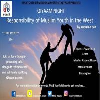 Join us for another great qiyaam as we learn about our responsibilities in the west by Birmimgham's very own speaker, Abdullah Saif.