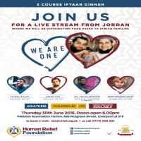 Join Human Relief Foundation for the We Are One Iftaar this Ramadan for a fantastic night of entertainment, spiritual reminders and a LIVE video feed with Syrian families (Hosted by Waseem Iqbal and Adam Kelwick).